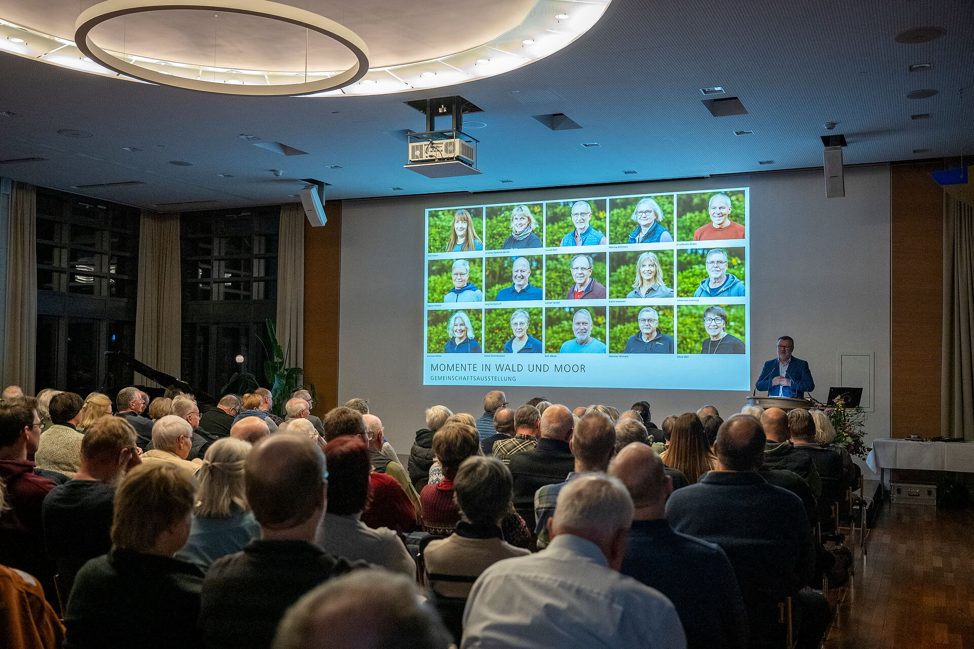 Wie immer gab es auch eine begleitende Ausstellung zu den Fototagen – erstmals als Gruppen-Portfolio. Zu sehen sind „Momente in Wald und Moor“ von Ines Adam, Andrea Aeckerle-Müller, Ewald Best, Marina Dittmers, Friedhelm Drees. Sabine Gebele, Jörg Hüttenhoff, Lothar Jandel, Karin Loewner, Johannes Ludwigs, Vanessa Möller, Heike Schendzielorz, Dirk Weise, Günther Wichert und Silvia Will. 15 Köpfe, ein riesiger Fundus an Motiven: Wie findet man da zusammen und wählt aus, wenn der Platz nur für 42 Motive reicht? Das erklärten einige der Mitwirkenden in einem Podiumsgespräch mit Sandra Bartocha.
